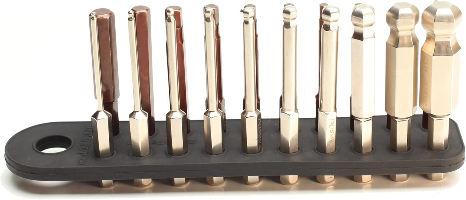The Bit Belt has a consistent holding force. There are no tight/stuck bits, and no loose bits that fall out easily. Every bit comes out with the same pull force. Every bit inserts with the same pull force. This is because the annular groove on 1/4-inch hex bits is standardized (standard is given by ASME B107.4).